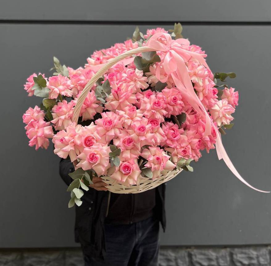 Воздушные соцветия эустомы собраны в округлую композицию с мягким переходом пастельных тонов. Светлая корзина создает легкую базу для объемной цветочной шапки.