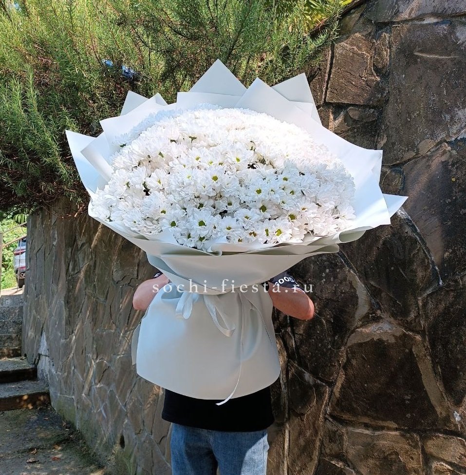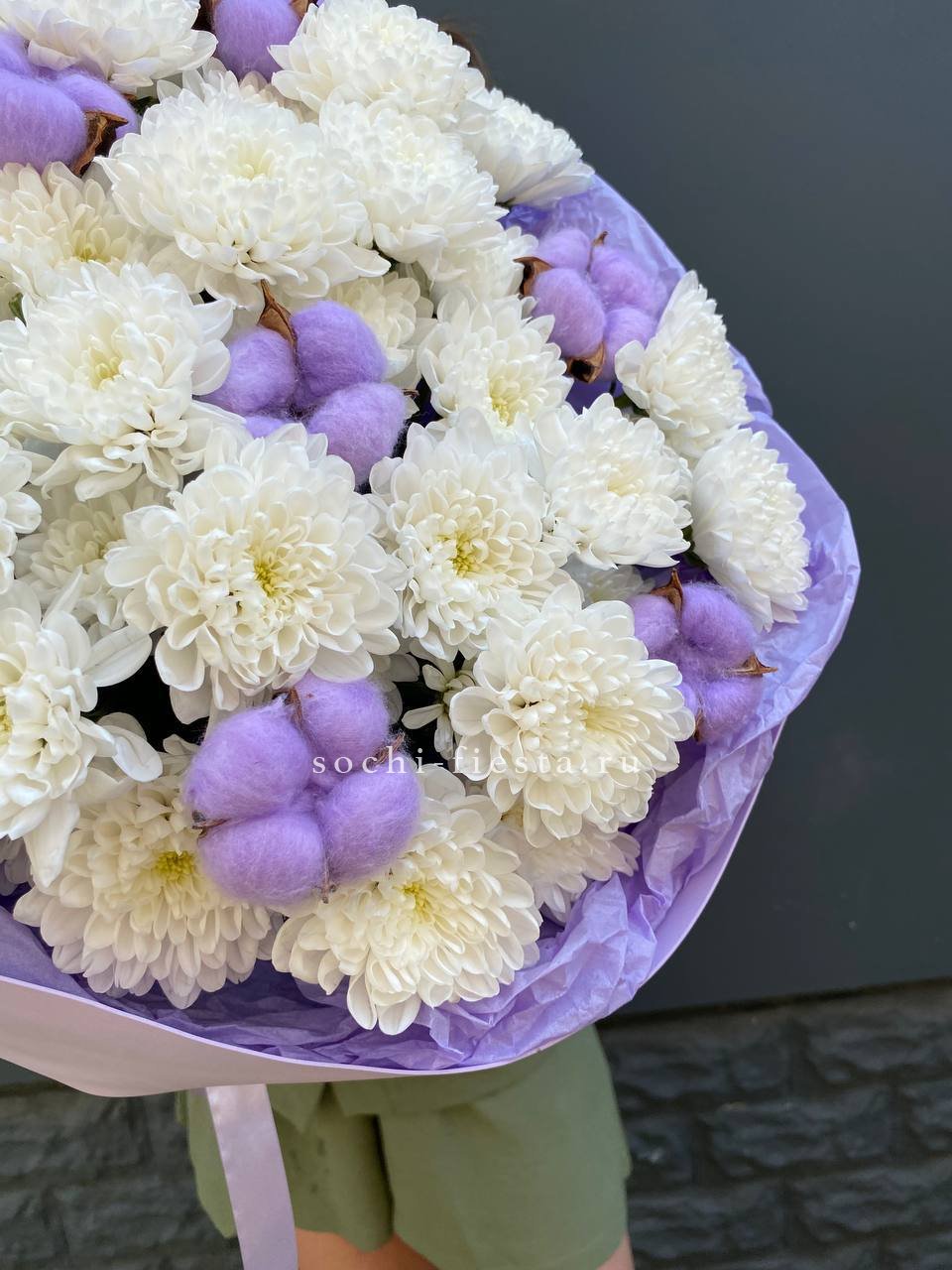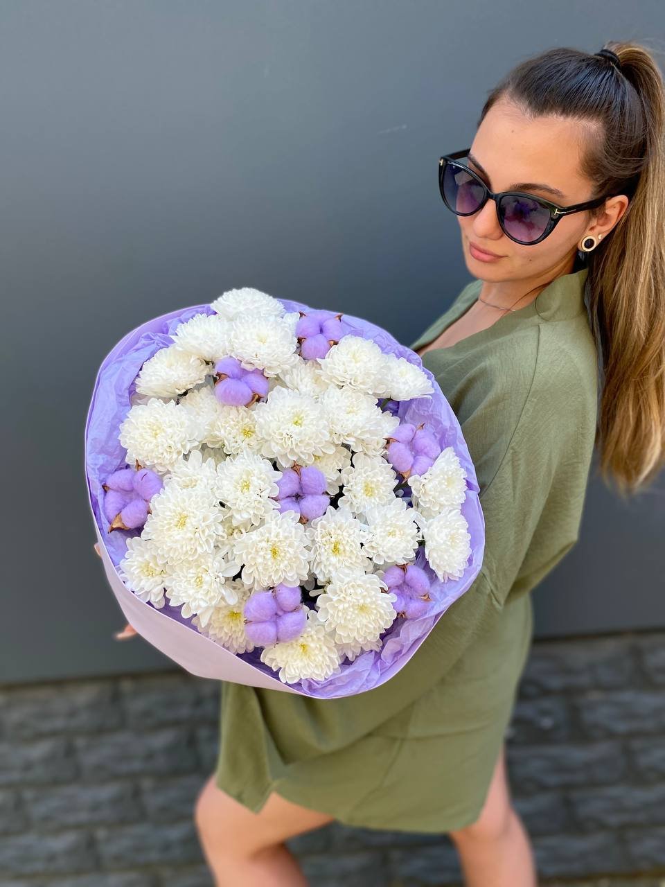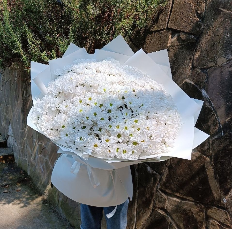 Пятнадцать веток кустовой хризантемы в натуральном крафте. Множество мелких соцветий формируют пышную шапку с естественной россыпью бутонов, подчёркнутую простотой оформления.