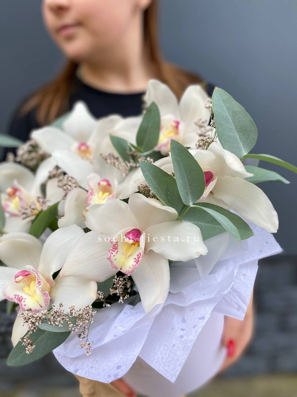 орхидея цимбидиум - 7 шт., декоративная зелень, упаковка на выбор.