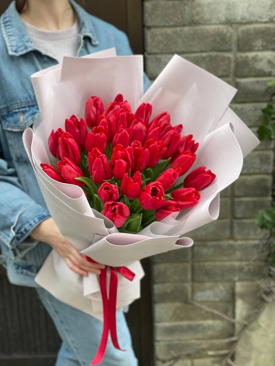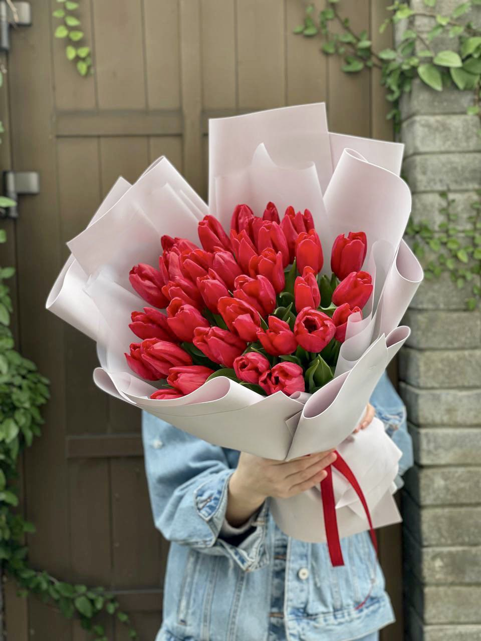 Сто один тюльпан ярко-красного цвета собраны в плотную вертикальную композицию. Весенняя свежесть и насыщенный оттенок лепестков создают мощное цветовое пятно, которое оживляет любое пространство.