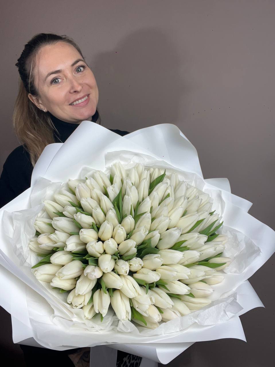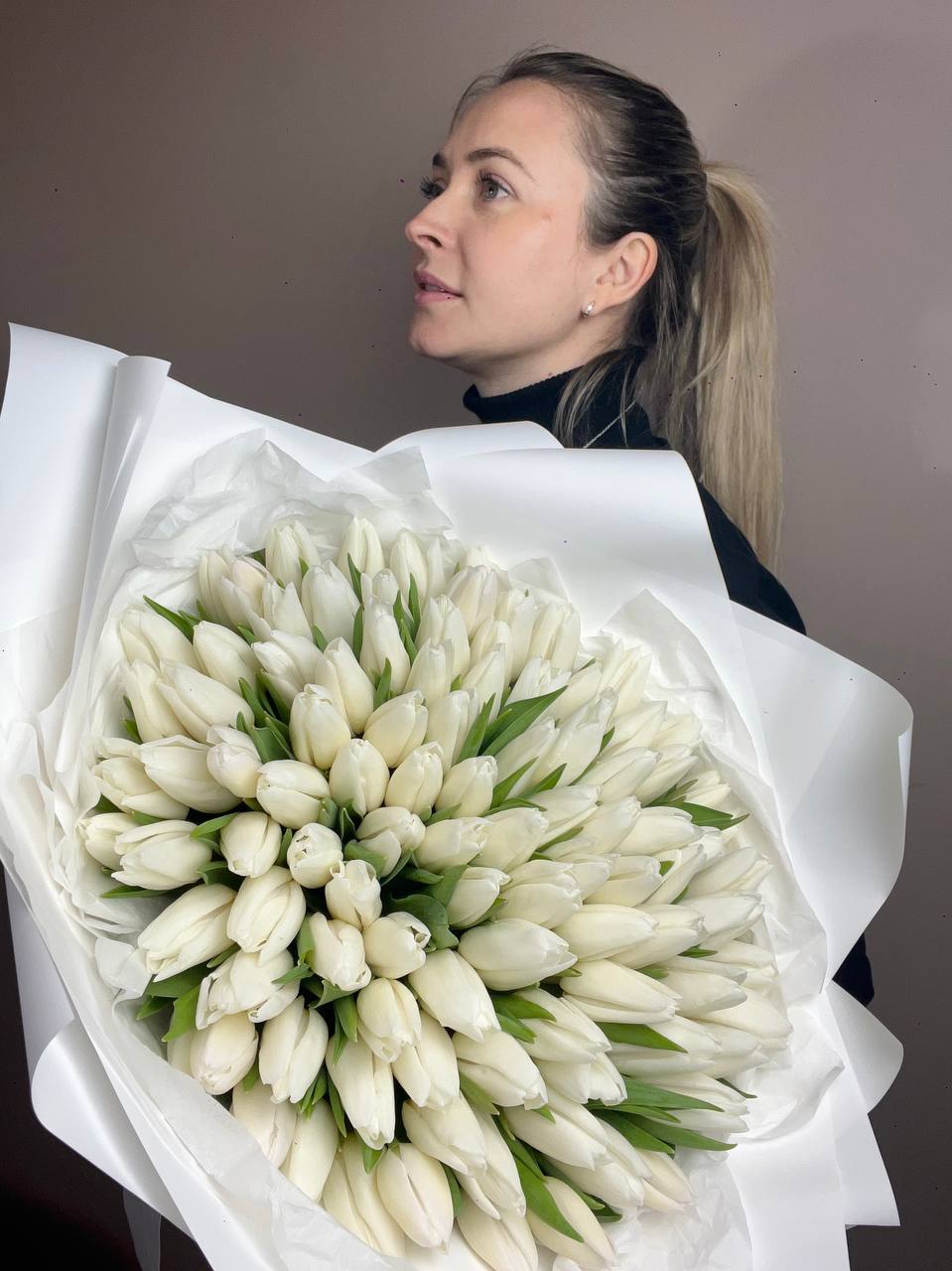 Пятнадцать белоснежных бутонов в лаконичной упаковке держат форму и сохраняют свежесть надолго. Тюльпаны раскрываются постепенно, их лепестки плотные и аккуратные. Композиция удобна для размещения в любой вазе.