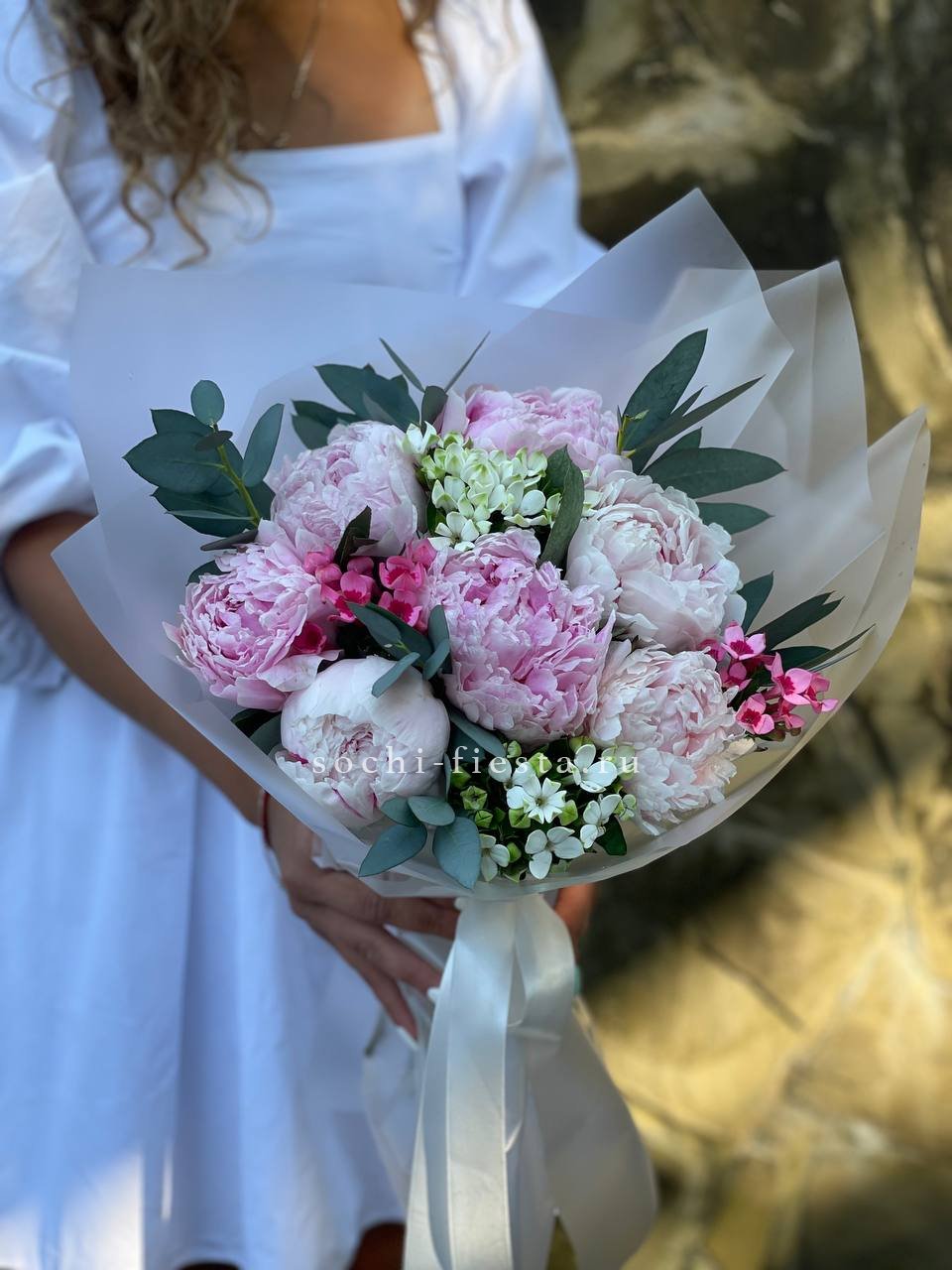 7 розовых пионов сорта Сара бернар, эвкалипт, бувардия (замена вне сезона) лента, оформление.