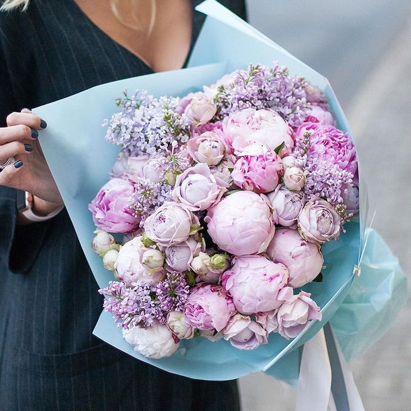 пионы, кустовая пионовидная роза, маттиола (или сирень), лента, дизайнерская упаковка.