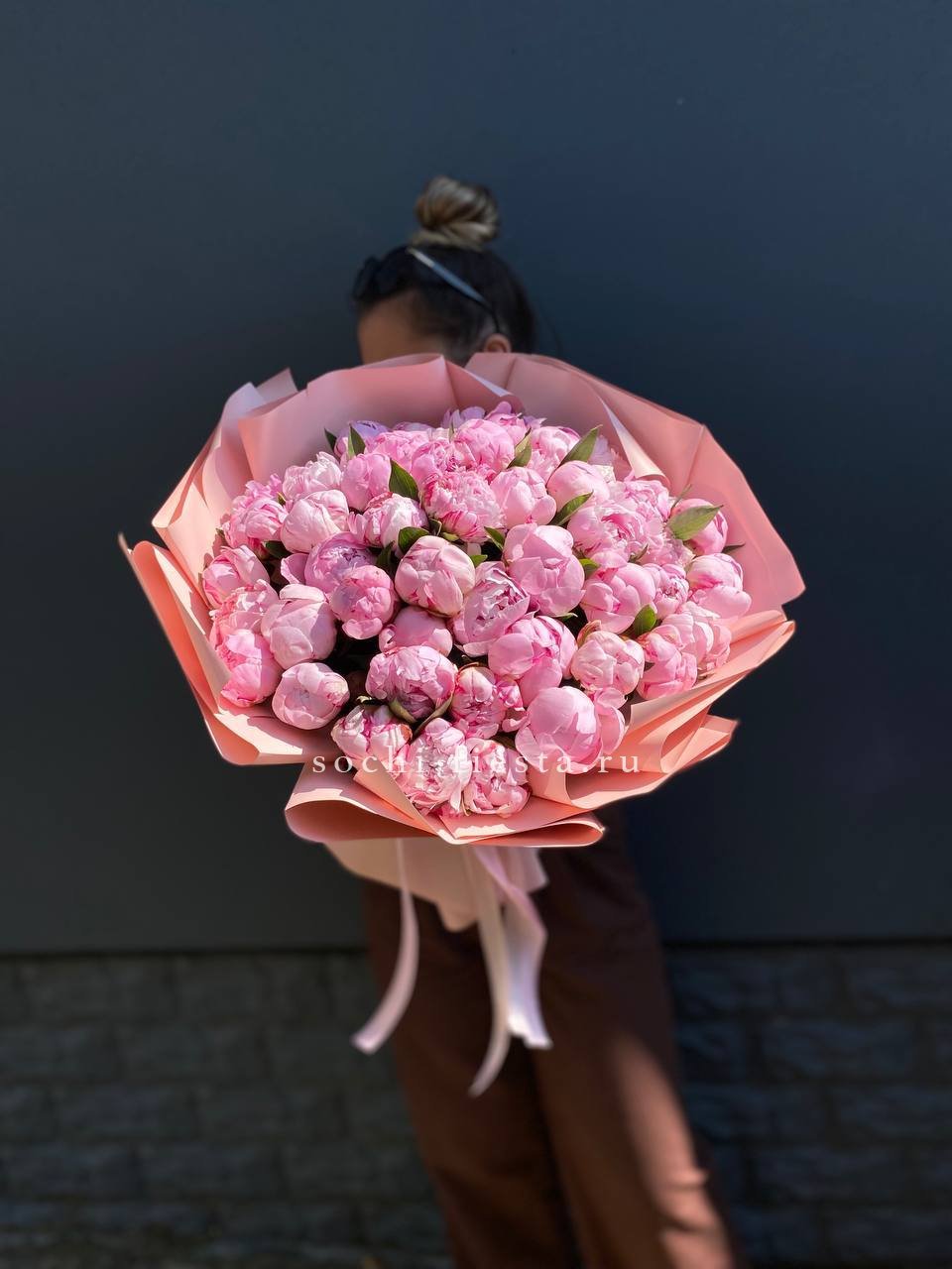 Пятьдесят один пион собраны в объёмную композицию, которая заполняет пространство цветом и ароматом.