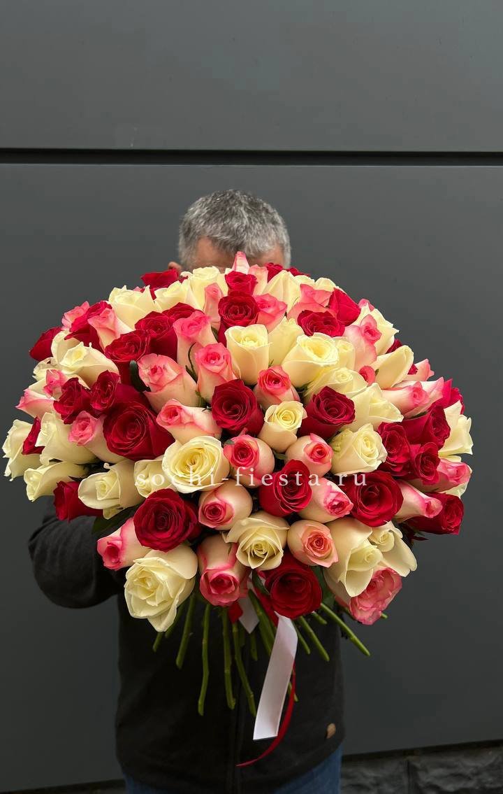101 белая и розовая роза, лента.