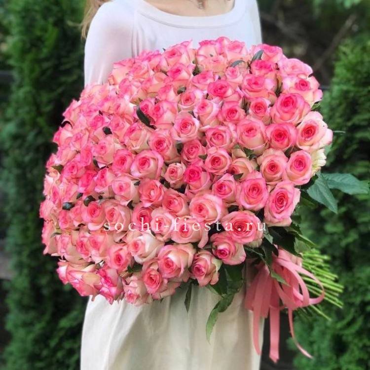 Сто один бутон в бело-розовой палитре создают объёмное облако цвета. Композиция впечатляет масштабом и наполняет пространство мягким сиянием лепестков.