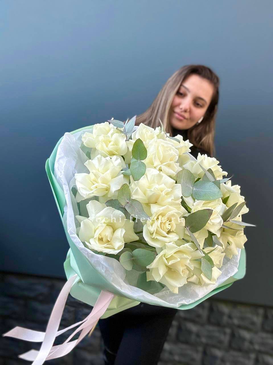 вывернутые розы - 15 шт., эвкалипт-1шт., лента, авторская упаковка.