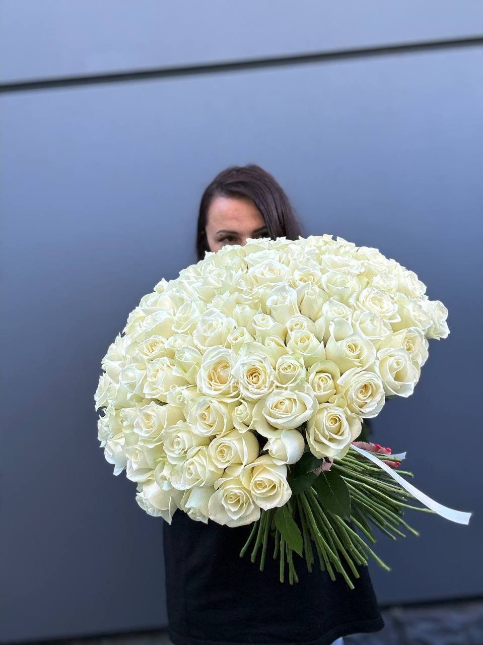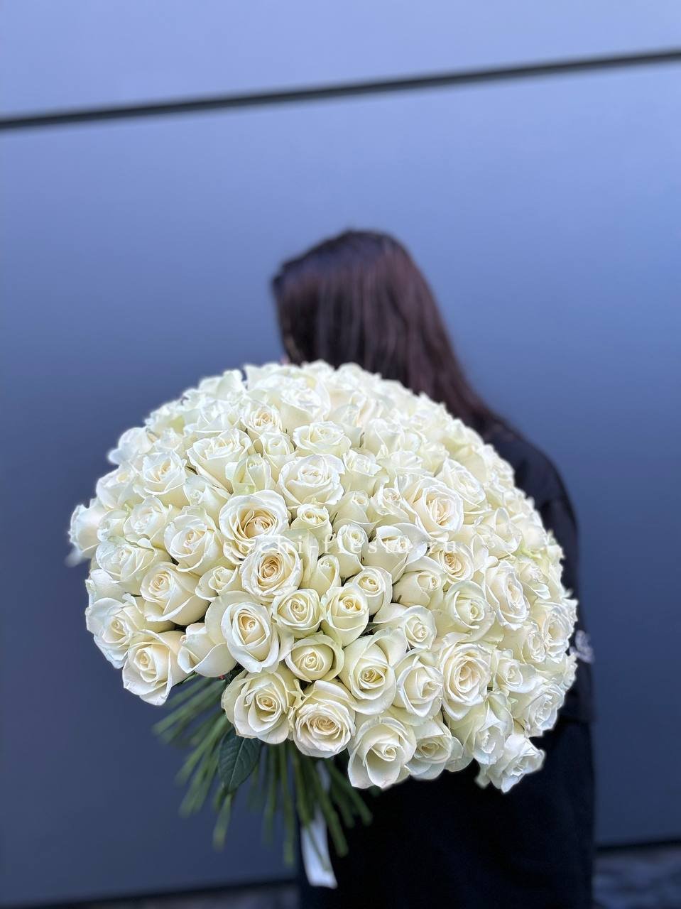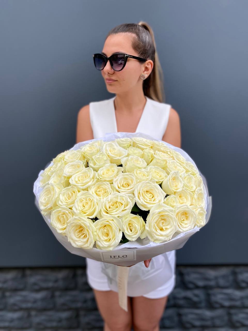 Белые розы собраны в плотную округлую форму с ровным силуэтом. Дизайнерская упаковка подчёркивает графичность линий и создаёт завершённую композицию. Букет с выразительным присутствием.