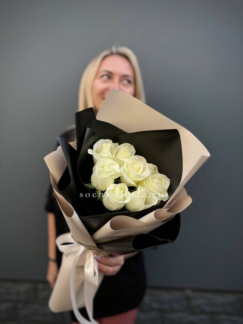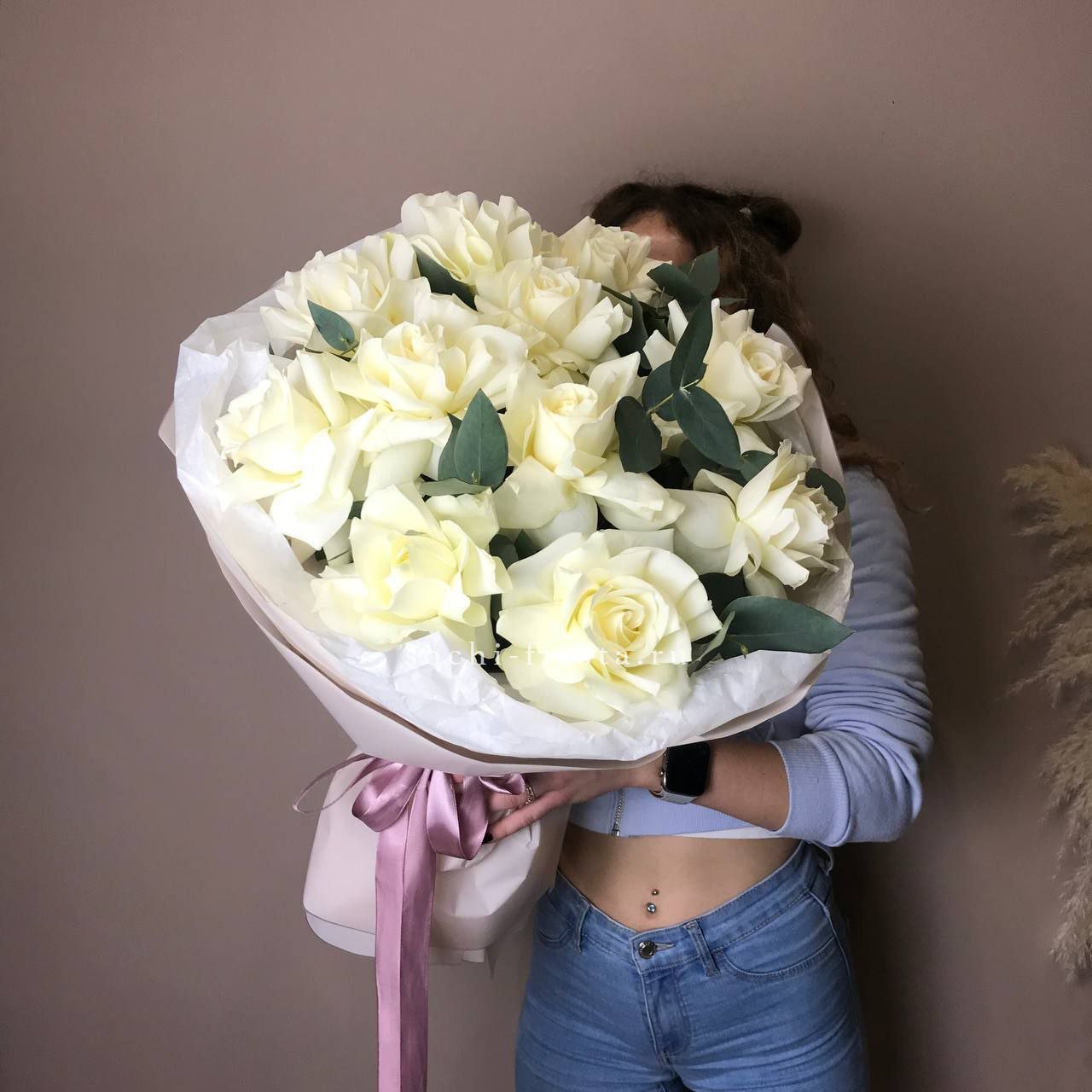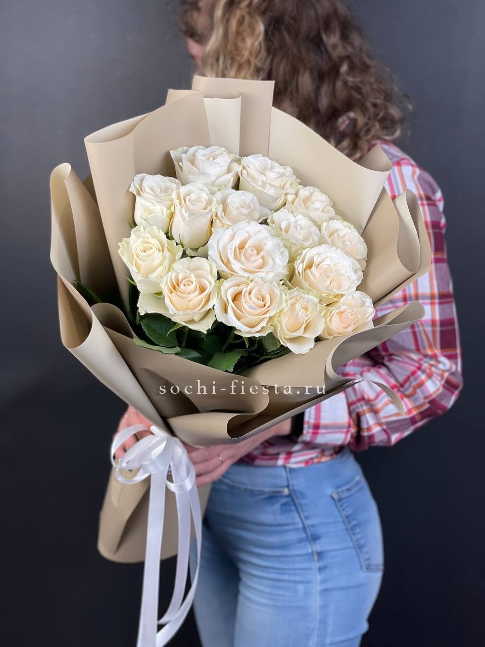 Пятнадцать белых роз в тонкой дизайнерской упаковке создают ощущение лёгкости и чистоты. Матовая текстура бумаги и мягкие складки подчёркивают форму каждого бутона. Композиция выглядит свежо и современно.