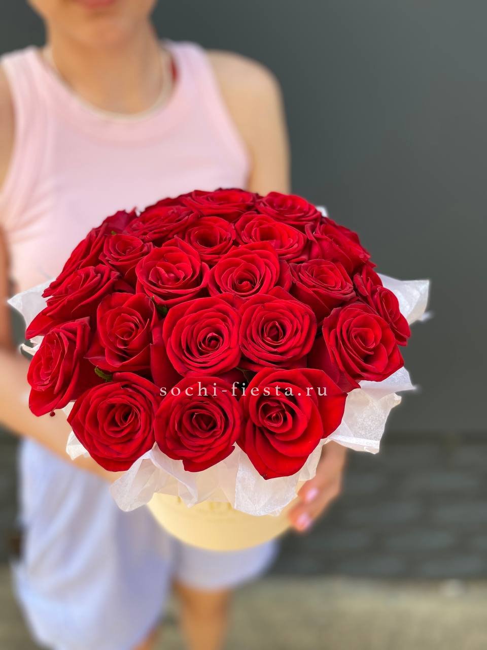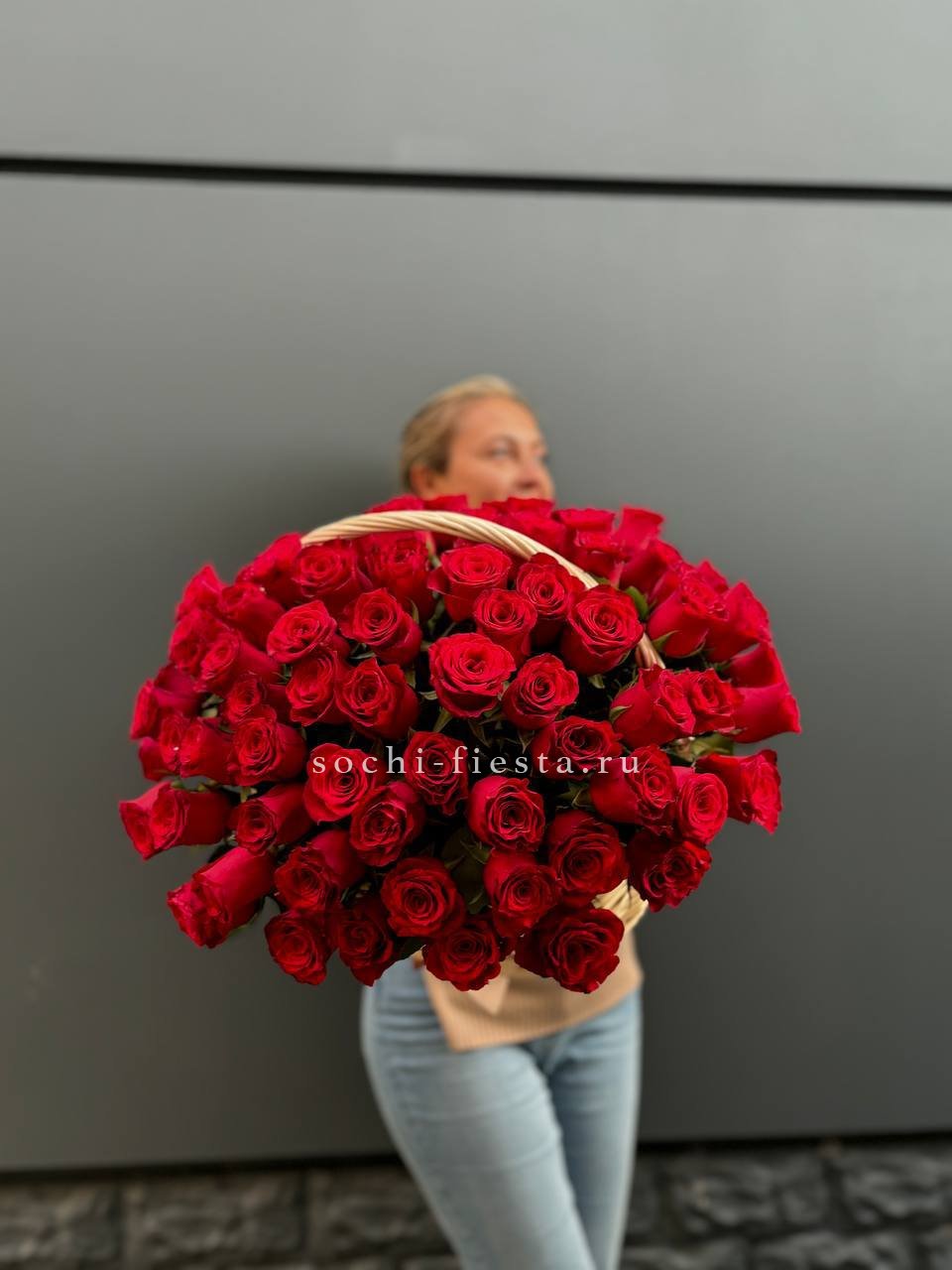 Сто одна роза насыщенного алого оттенка собрана в плетеной корзине. Плотная округлая форма создает впечатление цветочного купола. Практичное решение для масштабного жеста.