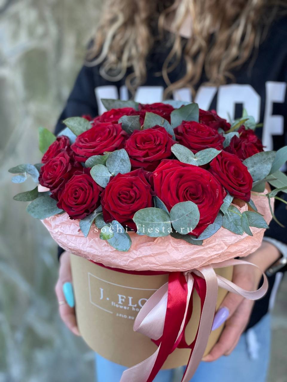 Одиннадцать роз сорта Naomi радуют глубоким красным оттенком и бархатистой поверхностью лепестков. Композиция выглядит свежо и уверенно в любом интерьере.