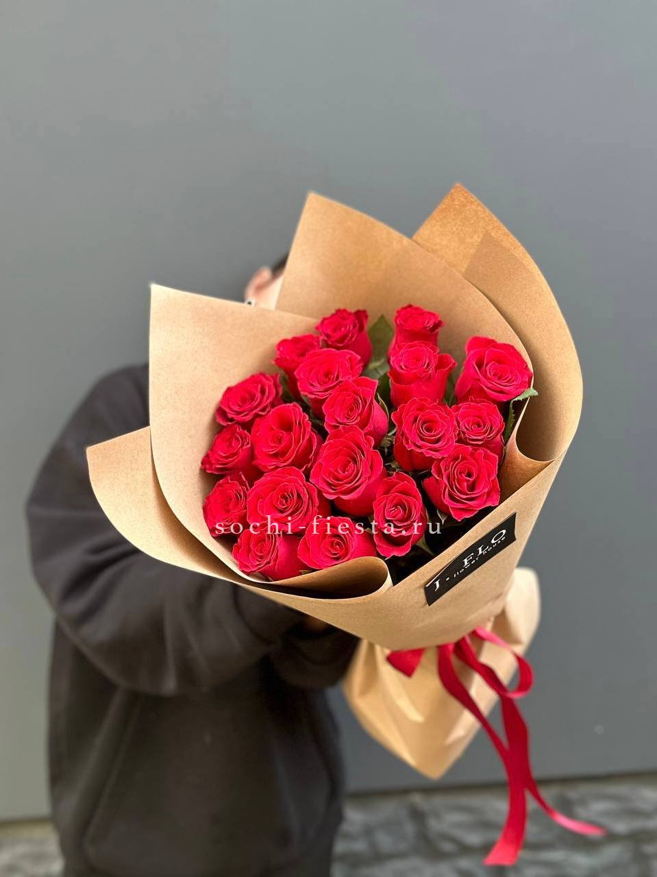 Красные розы в количестве девятнадцати стеблей, оформленные в матовую крафт-бумагу. Минималистичная обертка не отвлекает от насыщенного цвета и упругих бутонов. Простое решение с четким характером.