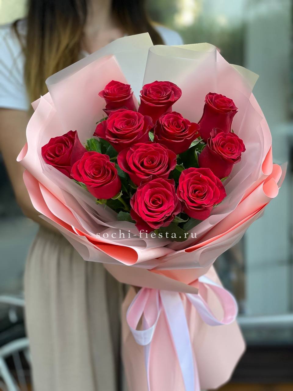 Яркие красные головки роз привлекают взгляд и удерживают его. Цвет насыщенный и живой, букет выглядит выразительно в любом освещении.
