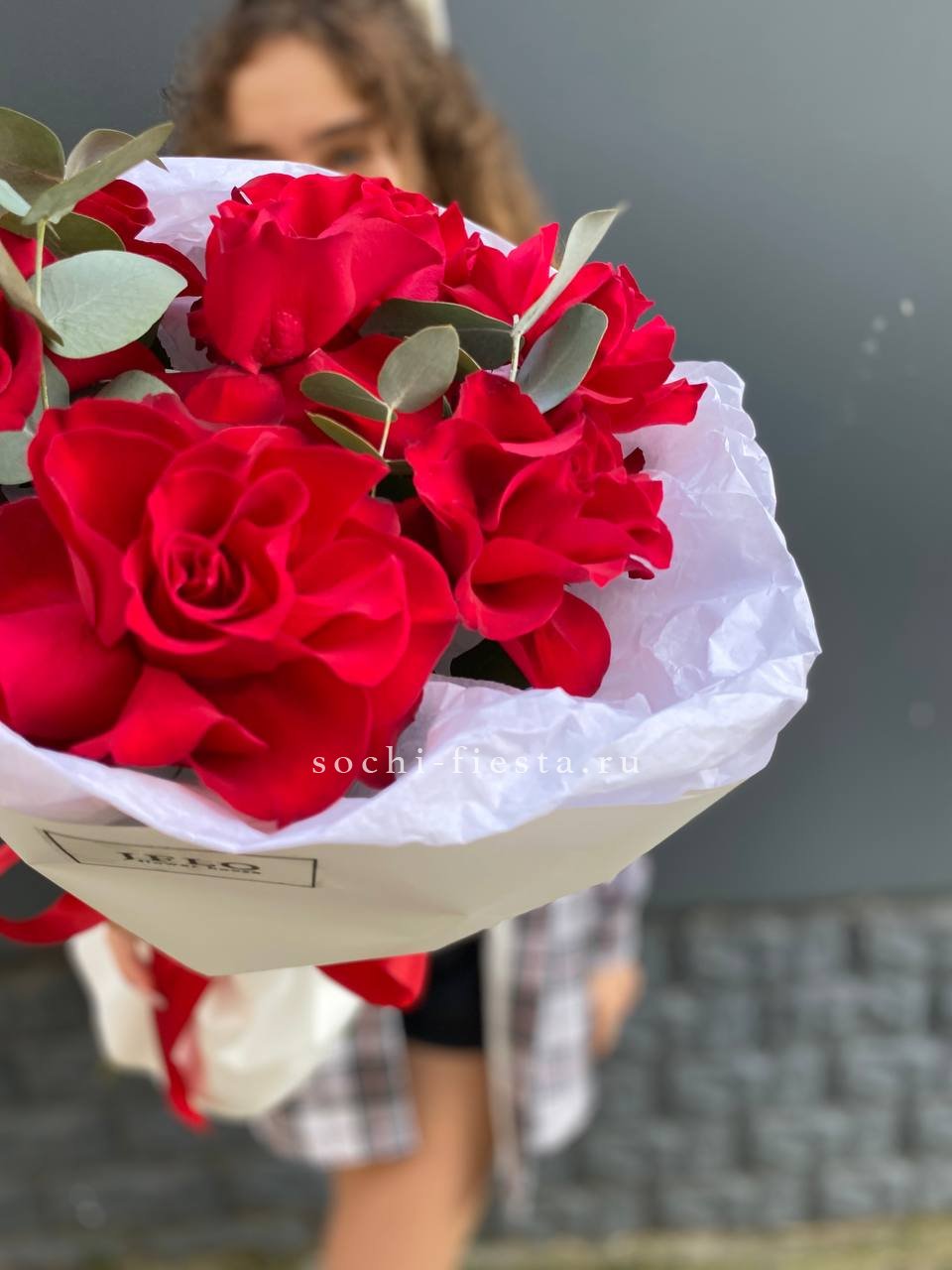 Французские розы с вывернутыми лепестками образуют пышную фактуру и глубину. Эвкалипт оттеняет насыщенность красного и придаёт букету свежесть.