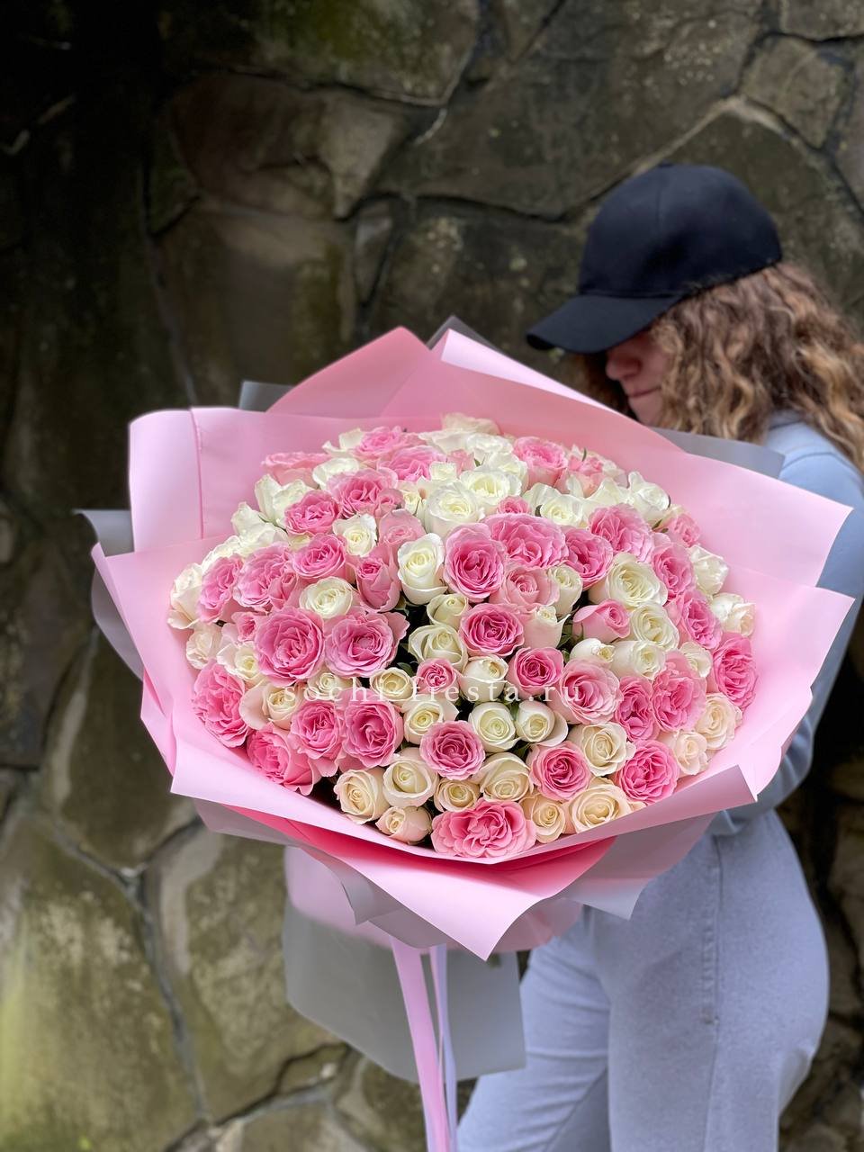 Переход от белого к розовому создаёт мягкую игру тонов. Эвкалипт добавляет фактурности и свежести зелени. Одиннадцать роз складываются в гармоничную композицию с лёгким характером.