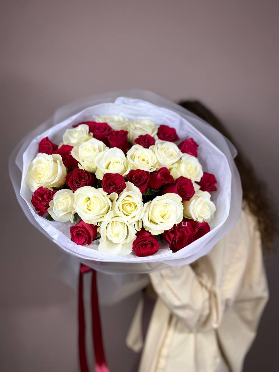 В составе 45 красно-белых роз.