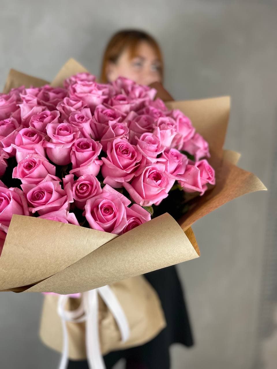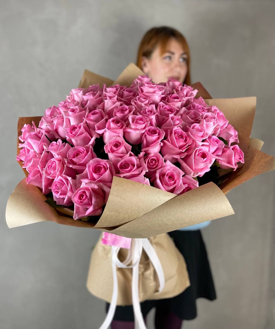 Сто одна роза пудрово-розового оттенка образует монохромное облако из бутонов. Классическая форма в современной подаче для тех, кто предпочитает говорить цветом без лишних слов.