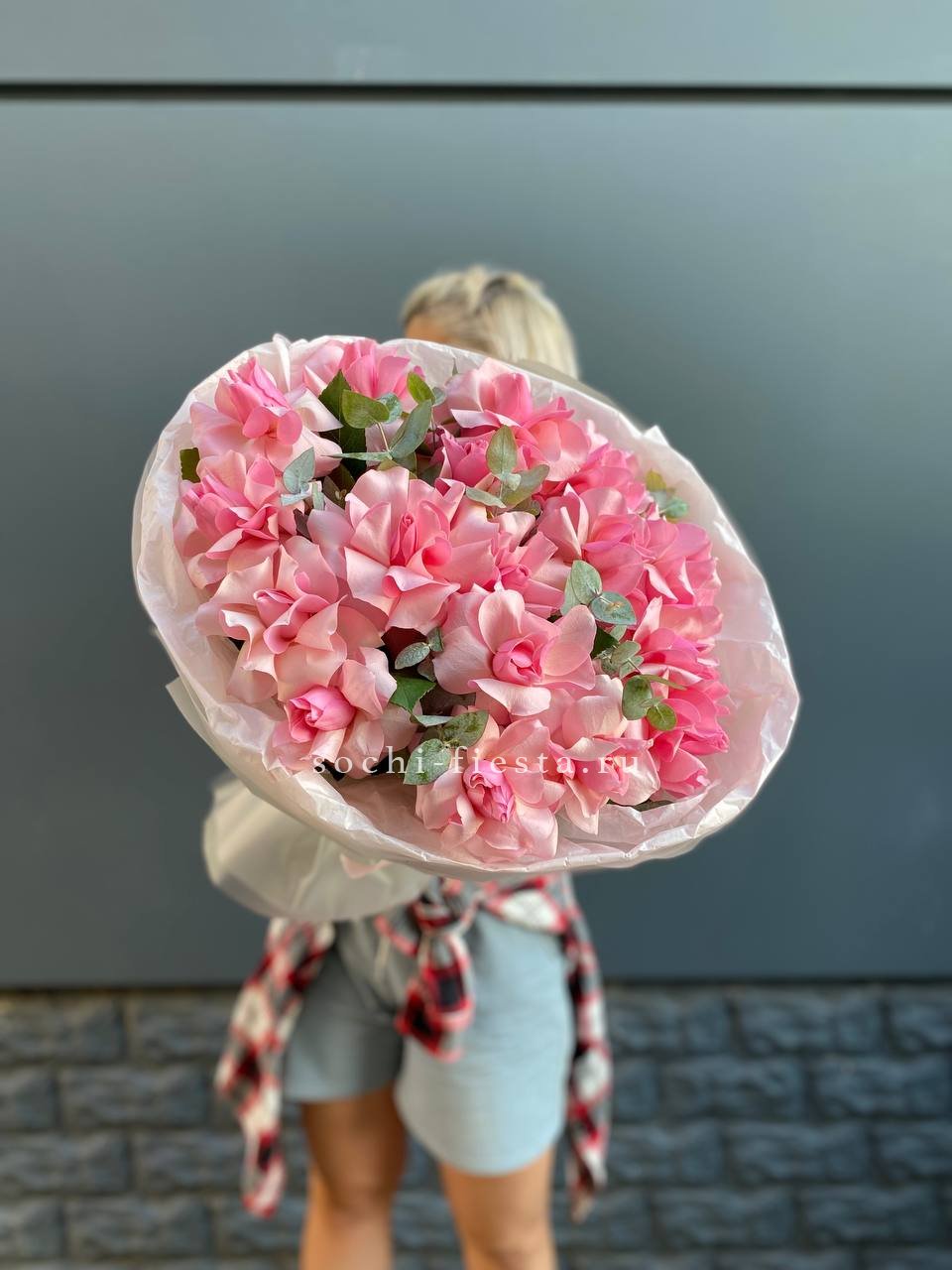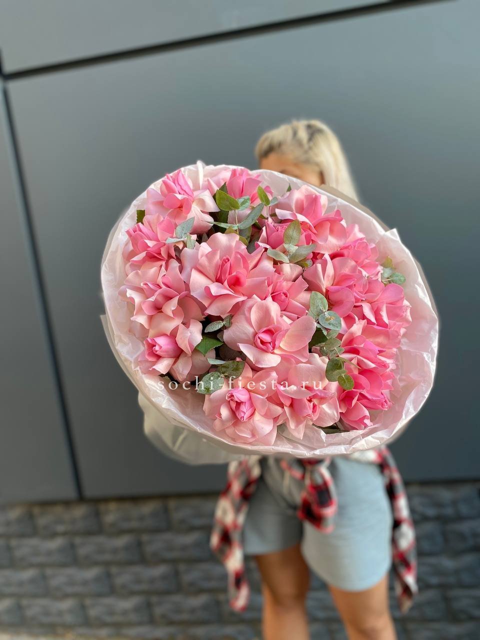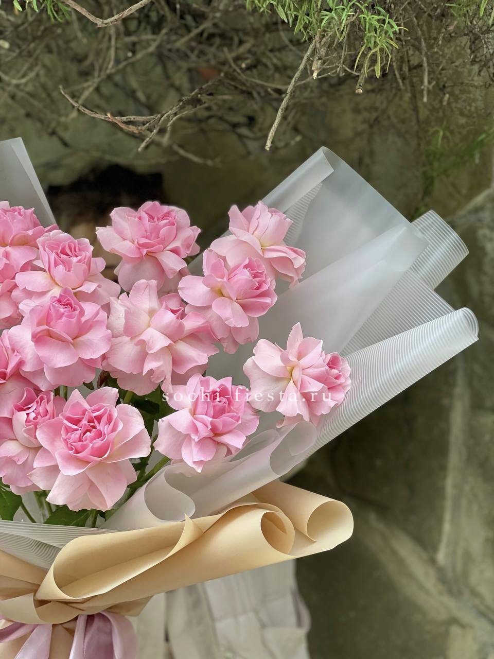 Сорт Mondala привлекает густыми лепестками с белой каймой и насыщенной розовой серединой. Пятнадцать бутонов собраны плотно и раскрываются постепенно. Кенийская пионовидная форма добавляет букету глубину и выразительность.