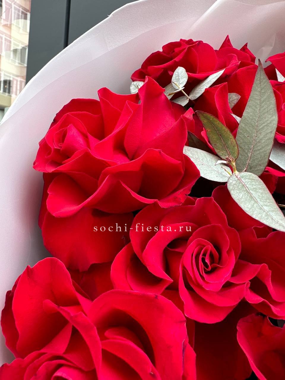Одиннадцать французских роз с вывернутыми лепестками раскрывают всю глубину бутона. Насыщенный красный цвет и графичная форма создают яркое присутствие.