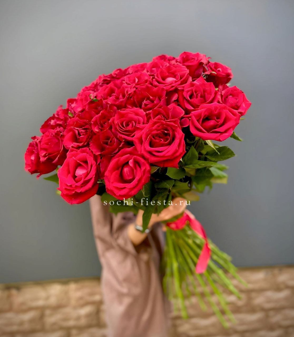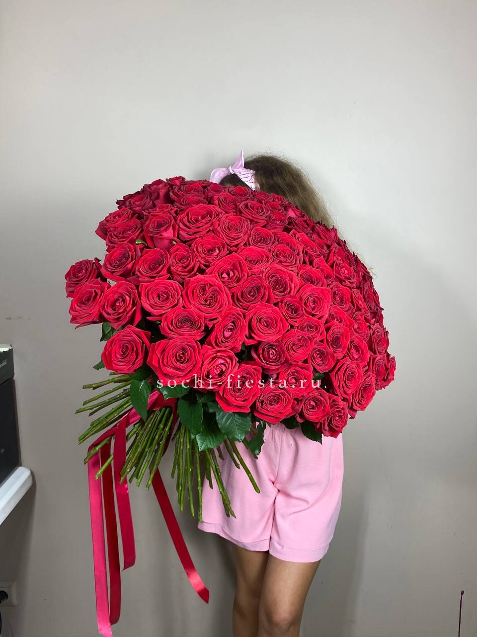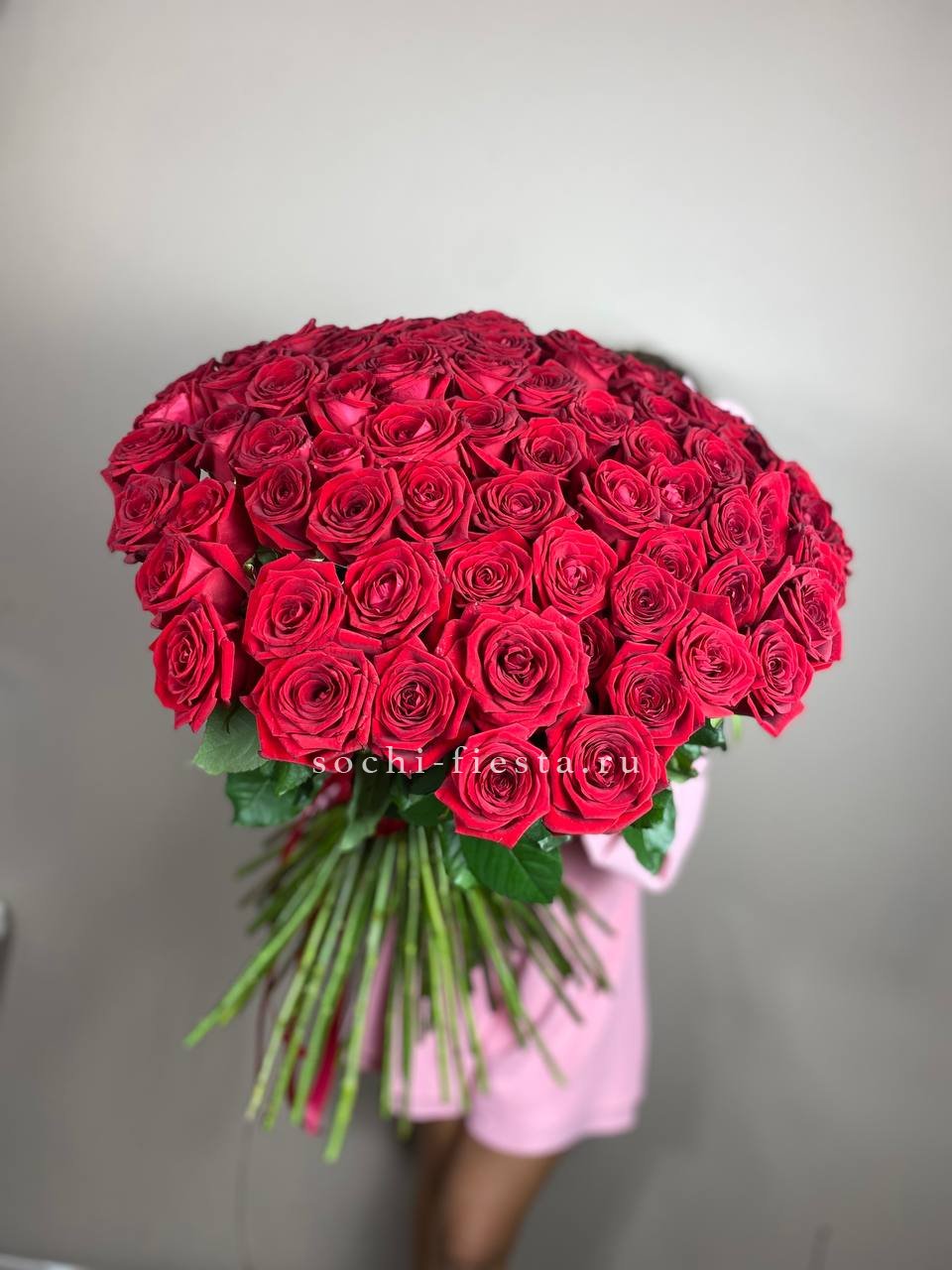 Плотная сборка из ста одной розы образует густую шапку бутонов глубокого красного цвета. Каждый цветок раскрывается постепенно, создавая живую фактуру и визуальную глубину композиции.