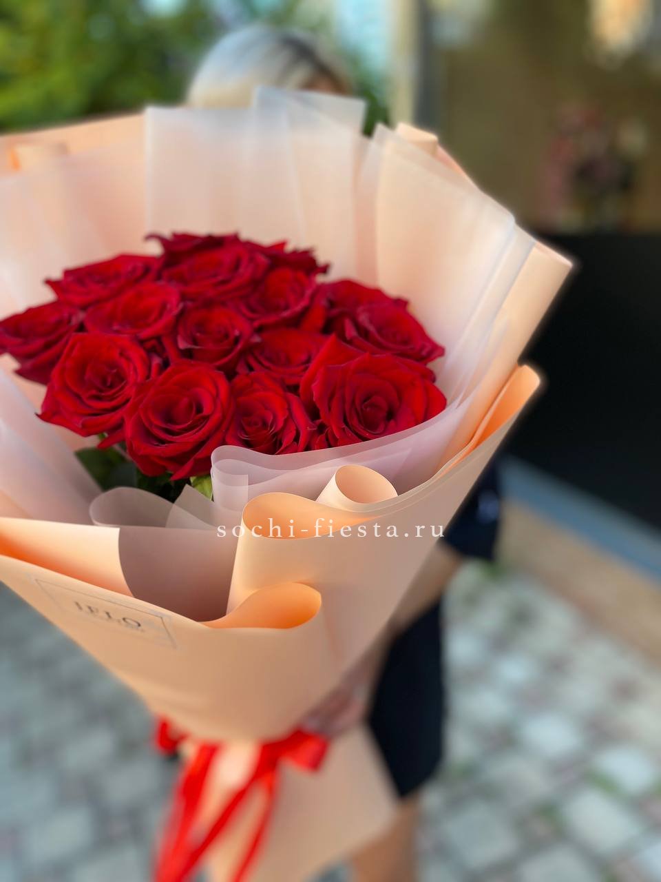 15 красных голландских роз 70 см, пленка, лента.