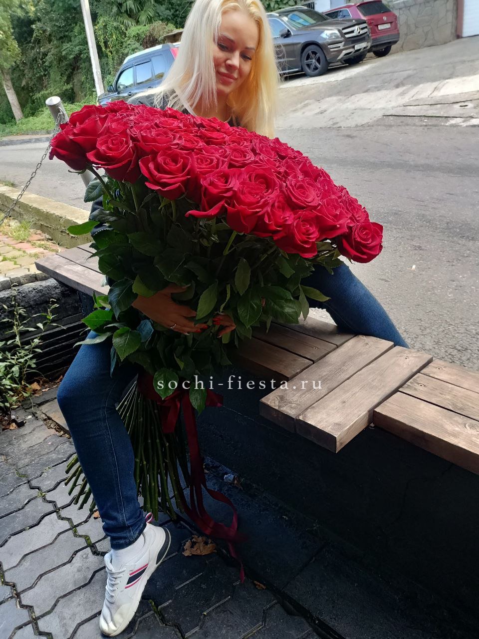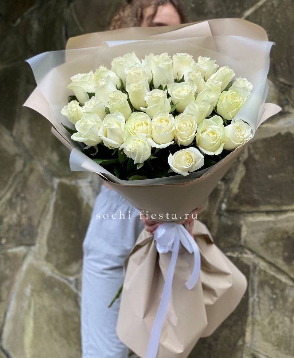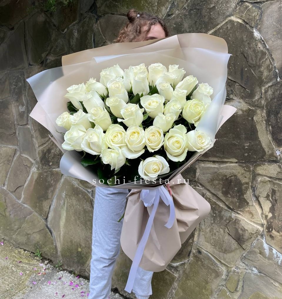 Пятьдесят один белоснежный бутон создаёт объёмное облако с мягкими переходами света и тени. Голландские розы держат форму и заполняют пространство плотной текстурой лепестков.