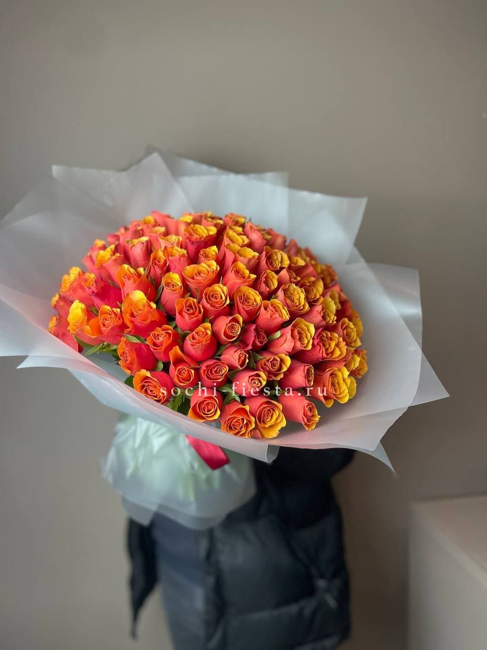 Сто один бутон ярко-алого оттенка собраны в монументальную композицию. Кенийские розы формируют плотную полусферу, где каждый цветок дополняет общий ритм. Это букет, который заполняет пространство цветом и энергией.