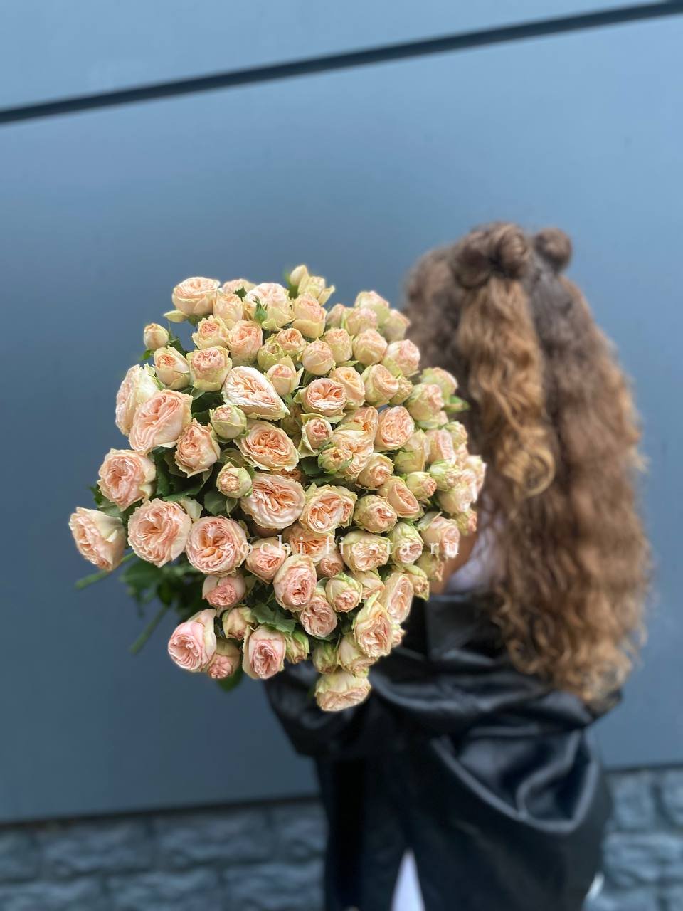 Двадцать пять пышных пионовидных роз собраны в плотный купол, где каждый бутон раскрывается слоями густых лепестков. Объёмная композиция заполняет пространство живой текстурой и создаёт ощущение abundance.
