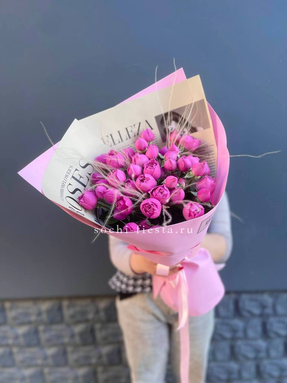 Пятнадцать пионовидных роз дополнены воздушным ковылём в минималистичном оформлении. Текстура густомахровых бутонов раскрывается слоями кремово-розовых лепестков с бежевым отливом.