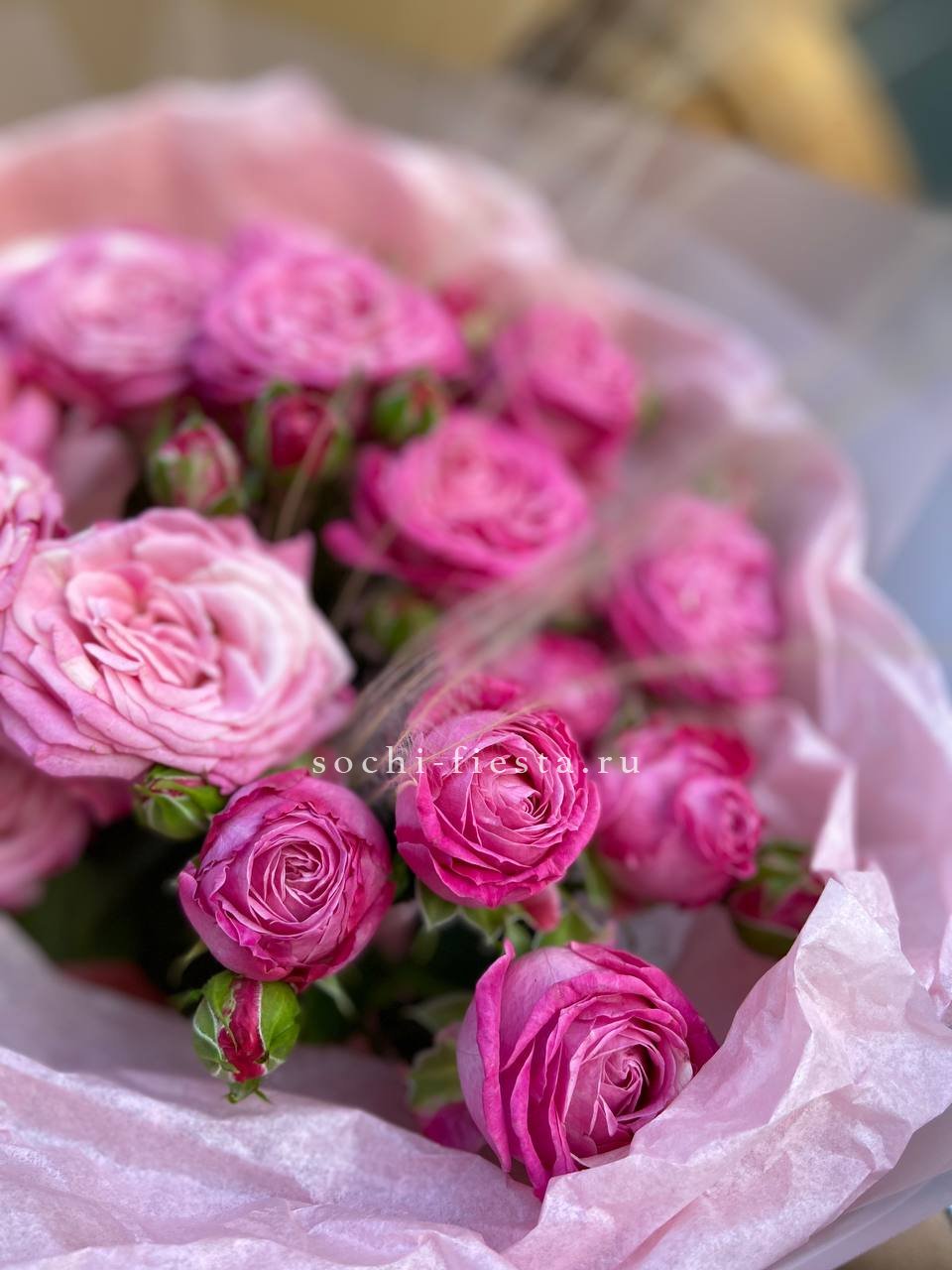 розовые кустовые розы 5 шт., лента, дизайнерская пленка комбинированная.