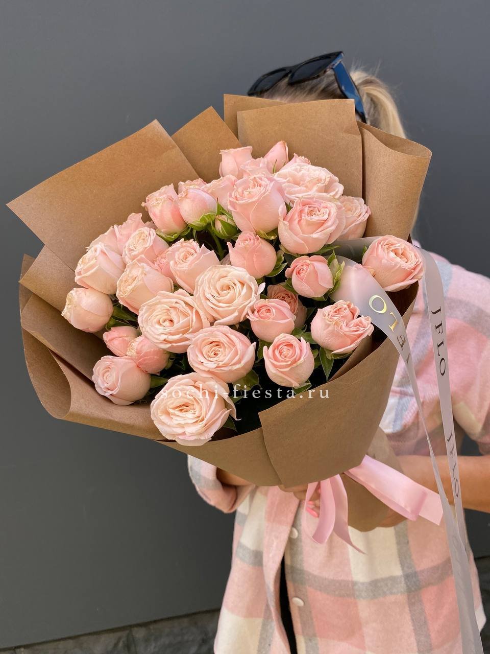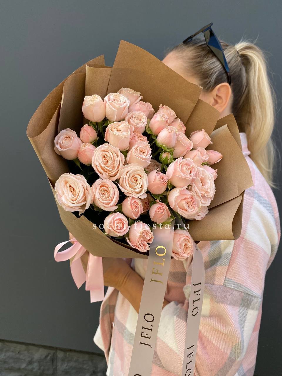 Девять кустовых роз собраны в компактную форму с мягким розовым оттенком. Множество небольших бутонов создают объемную текстуру и природную легкость. Букет упакован в матовую бумагу с лентой.
