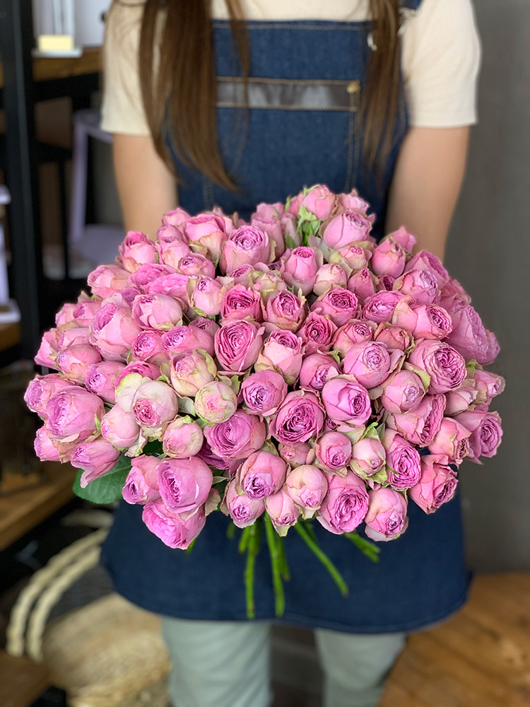 минимальный состав: 9 лавандовых пионовидных кустовых роз, лента, упаковка на выбор.