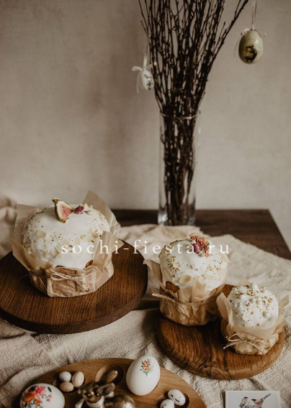 Традиционная выпечка с румяной корочкой и белоснежной глазурью. Внутри мягкое тесто с изюмом, курагой и финиками, которое наполняет пространство теплым ароматом. Весенний символ, который создает ощущение светлого праздника и уюта.